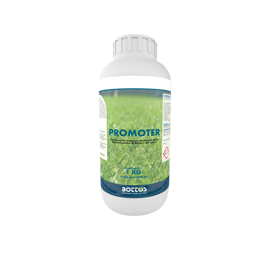 PROMOTER è un fertilizzante liquido specificatamente studiato per la nutrizione tecnica dei tappeti erbosi costituiti dalle essenze macroterme della linea Zollaverde Macro. Manifesta una potentissima azione biostimolante in ogni organo dei vegetali. È ottenuto attraverso la controllata fermentazione di specifici gruppi di lactobacilli in una base zuccherina, dove, a seguito dell’eliminazione dei batteri, si ottiene l’eluato. Contiene una grande quantità di zuccheri, acido esaonico (che attiva i processi d’induzione di resistenza creando barriere naturali contro gli antagonisti e promuovendo un meccanismo di difesa indotta), acido salicilico, acido jasmonico e callosio (capace di ridurre lo stress ossidativo, accelerando la crescita delle piante che così possono chiudere più velocemente gli spazi, non lasciare sfogo a potenziali infestanti e colonizzare tutta l’area a disposizione). PROMOTER è inoltre ricco in aminoacidi e metaboliti secondari prodotti dai lactobacilli. Di conseguenza nutre anche la flora microbica utile del terreno, favorendo la fertilità del medesimo e migliorando i processi di formazione delle radici delle essenze impiantate. Controlla e regola il dualismo dei processi di umificazione e mineralizzazione, rendendo beneficio ad ogni intervento di concimazione così come migliorando la qualità della sostanza organica contenuta nel substrato di coltura. Può essere miscelato con la maggior parte dei prodotti Bottos (concimi, biostimolanti, fitofortificanti, bioattivati, agenti umettanti). Non intasa gli ugelli e non produce incrostazioni nelle macchine irroratrici. La sua azione è efficace per un periodo di circa 2 settimane (ma crea effetto sinergico decisamente più duraturo con tutta l’attività microbica utile del terreno).