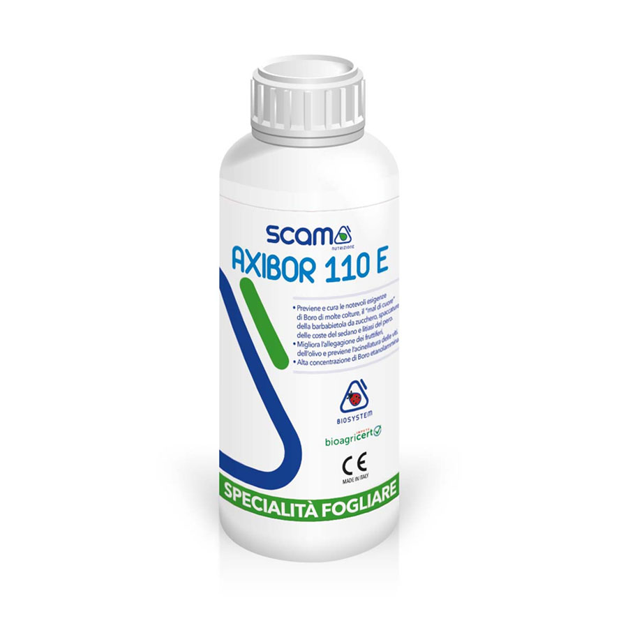 formulazione “flowable” è il risultato di uno specifico processo produttivo che abbina anche agenti adesivanti e veicolanti per ottenere una perfetta uniformità di distribuzione del prodotto per via fogliare. Il Boro è un elemento fondamentale per la vita delle piante ed entra in importanti funzioni biologiche: germinazione del polline e allungamento del tubetto pollinico, migliore assorbimento dell’Azoto, accrescimento dei tessuti, germinabilità dei semi, formazione e trasporto degli zuccheri agli organi di riserva. Il Boro è poco mobile nella pianta e i sintomi della carenza si manifestano inizialmente negli organi giovani con accorciamento interno della pianta, foglie piccole, fioritura scarsa, allegagione scarsa ed incompleta, basso tenore di zuccheri negli organi di riserva, Tipiche fisiopatie sono: mal del cuore della barbabietola da zucchero, acinellatura della vite, spaccature delle coste di sedano, spaccatura delle carote, mancata fecondazione nell’olivo, suberosi nel melo, Iitiasi del pero. AXIBOR 110 E permette anche di prevenire e curare le notevoli esigenze di Boro di cavoli, asparagi, girasole, erba medica, piante da frutto, drupacee, tabacco, orticole a fioritura scalare, colture da seme. Migliora il livello quanti-qualitativo della produzione.