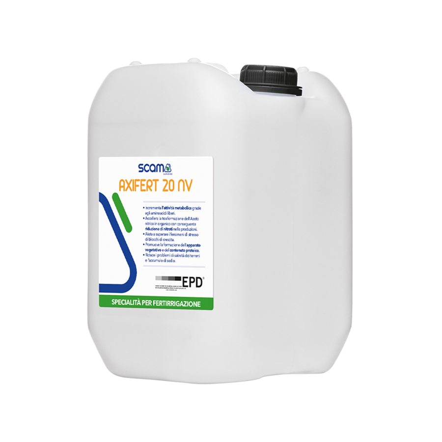 AXIFERT 20 NV è un concime Organo-Minerale fluido di ultima generazione. Frutto della ricerca e sperimentazione SCAM. La frazione – organica interamente di origine vegetale, garantisce una elevata capacità nutritiva e favorisce i processi biochimici delle piante e le colture. AXIFERT 20 NV è formulato con una matrice organica ottenuta con un processo fermentativo specifico che permette di ottenere una alta concentrazione di aminoacidi (> 25 %) di cui una elevata quota di aminoacidi in forma levogiri (>15%). Le differenti tipologie di aminoacidi presenti nella matrice organica sono maggiormente rappresentate da: AC. Glutammico, AC. Aspartico e Alanina. Contiene Betaine che consentono alla pianta di superare gli stress idrici.