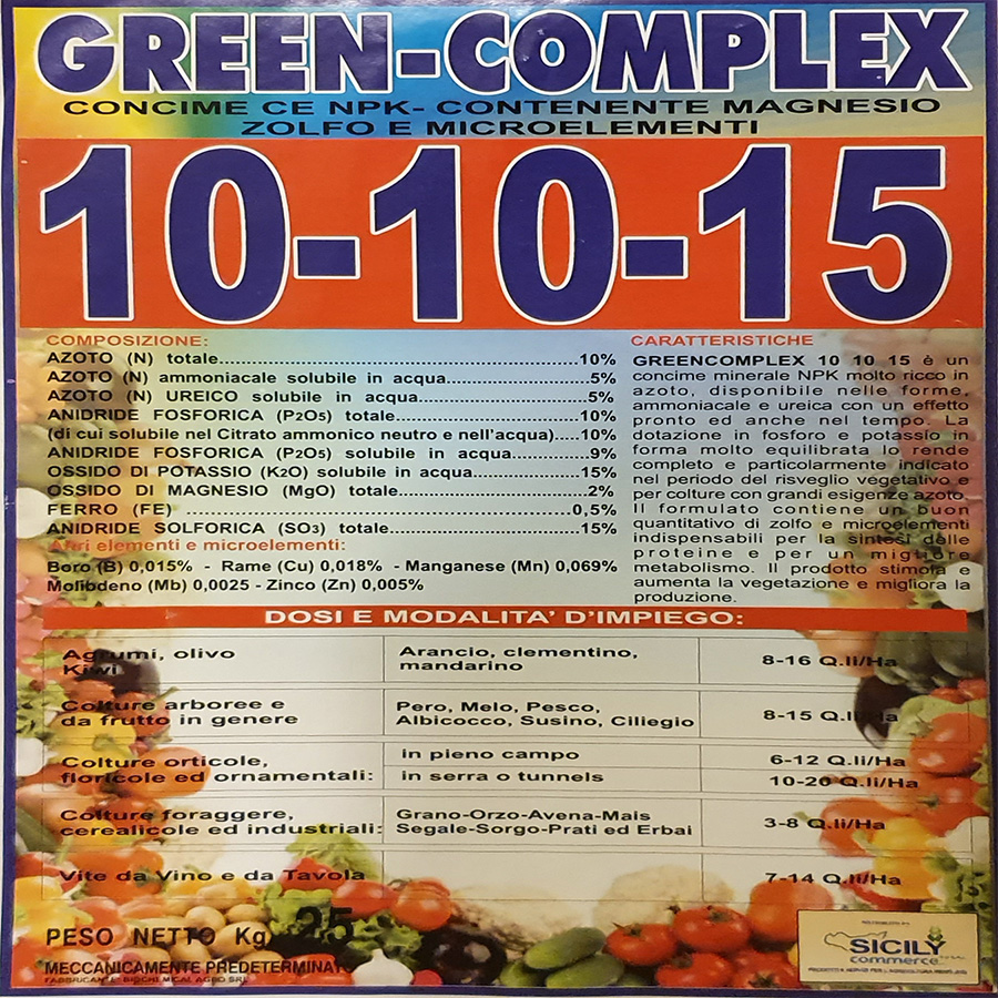 GreenComplex 10-10-15 è un concime minerale NPK molto ricco in azoto, disponibile nelle forme ammoniacale e ureica con un effetto pronto ed anche nel tempo. La dotazione in fosforo e potassio in forma molto equilibrata lo rende completo e particolarmente indicato nel periodo del risveglio vegetativo e per colture con grandi esigenze azoto. Il formulato contiene un buon quantitativo di zolfo e microelementi indispensabili per la sintesi delle proteine e per un migliore metabolismo. Il prodotto stimola e aumenta la vegetazione e migliora la produzione.