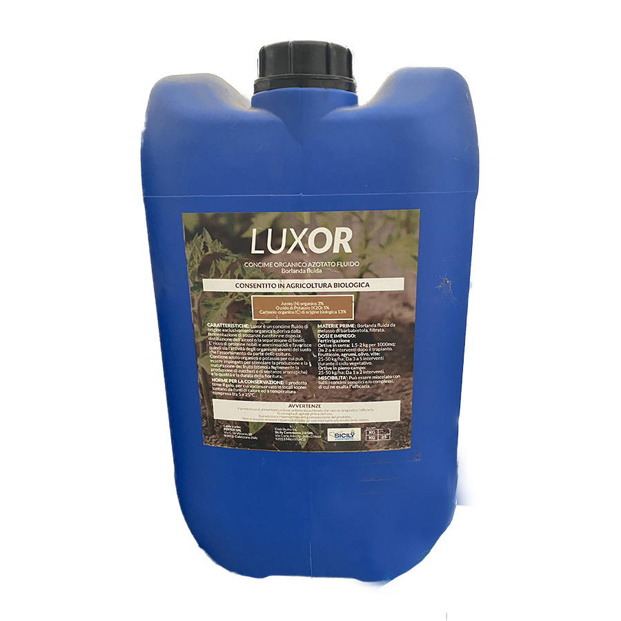 Luxor è un concime fluido di origine esclusivamente organica e deriva dalla fermentazione di sostanze zuccherine dopo la distillazione dell’alcool o la separazione di lieviti. E’ ricco di proteine nobili e amminoacidi e favorisce quindi sia l’attività degli organismi viventi del suolo che l’assorbimento da parte delle colture.