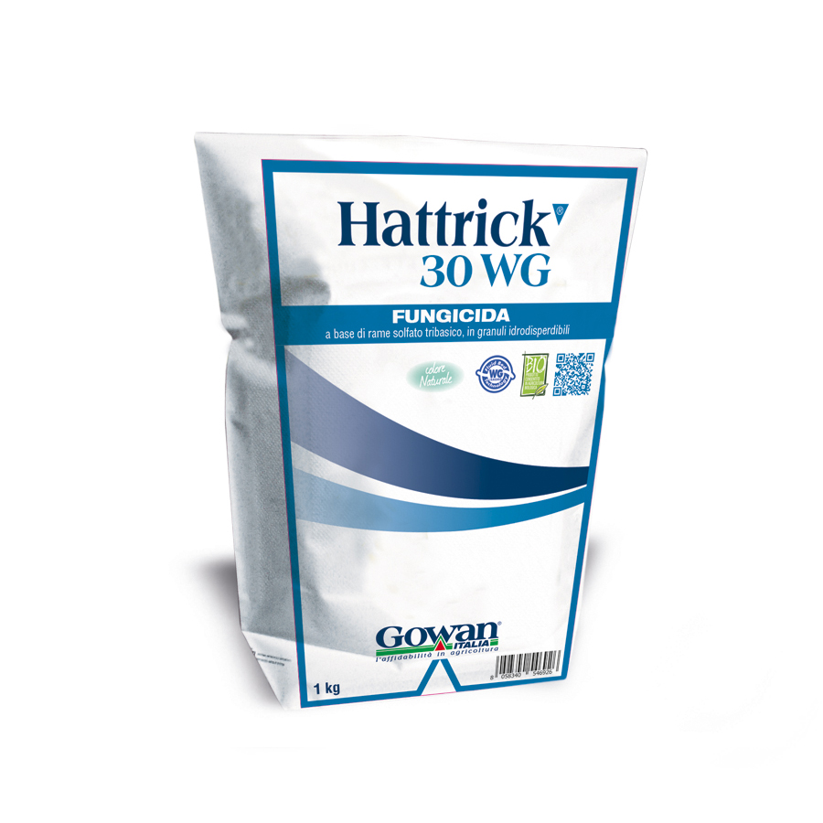 Hattrick® 30 WG è un formulato in microgranuli idrodisperdibili che per il suo originale processo produttivo e l’estrema finezza delle sue particelle è dotato di particolari caratteristiche di adesività e di uniformità ridistributiva sulle superfici fogliari. Tali caratteristiche consentono una maggiore efficacia fungicida e battericida ed una sensibile riduzione delle dosi unitarie di rame con conseguenti vantaggi anche sotto il profilo dell’impatto ambientale. Una scelta vincente, formulato innovativo estremamente efficace, che ottimizza l’equilibrio tra la velocità d’azione e la persistenza, per non indurre problemi di fitotossicità, anche in condizioni sfavorevoli. Il diametro estremamente ridotto dei micro-granuli conferisce al prodotto una migliore copertura fogliare, maggior adesività e protezione, oltre ad una elevata resistenza al dilavamento. Registrato su Kiwi e su diversi fruttiferi minori, si presenta sul mercato come soluzione versatile in diverse colture. Il tempo di carenza di soli 3 giorni su gran parte delle colture lo rende ideale anche sotto il profilo residuale. Al fine di ridurre al minimo il potenziale accumulo nel suolo e l’esposizione per gli organismi non bersaglio, tenendo conto al contempo delle condizioni agroclimatiche, non superare l’applicazione cumulativa di 28 kg di rame per ettaro nell’arco di 7 anni. Si raccomanda di rispettare il quantitativo applicato medio di 4 kg di rame per ettaro all’anno